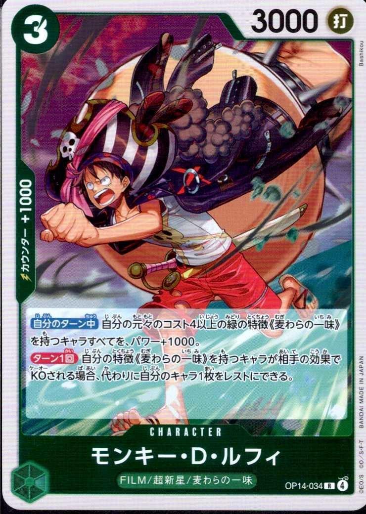 【自分のターン中】自分の元々のコスト4以上の緑の特徴《麦わらの一味》を持つキャラすべてを、パワー+1000。