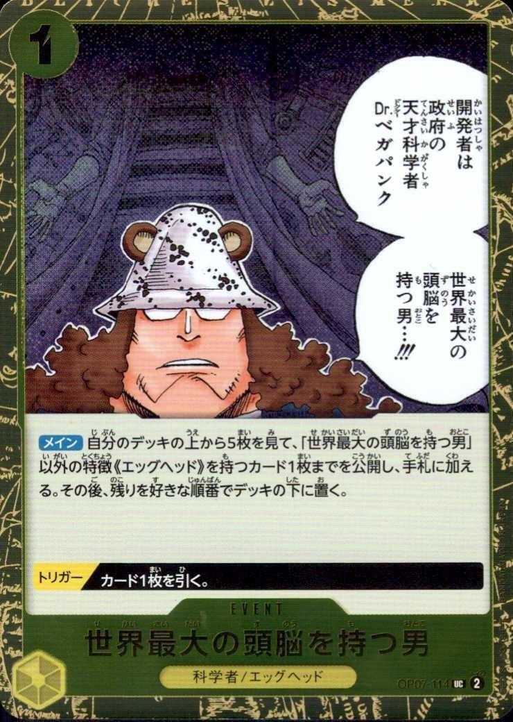 【メイン】自分のデッキの上から5枚を見て、「世界最大の頭脳を持つ男」以外の特徴《エッグヘッド》を持つカード1枚までを公開し、手札に加える。その後、残りを好きな順番でデッキの下に置く。